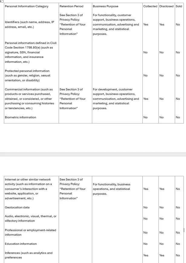 The categories of Personal Information collected, disclosed, and sold from California residents over the preceding 12 months and LEAD, The Success Coach Company applicable retention periods include:
